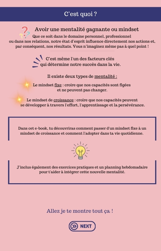 Dans cet e-book, tu découvriras comment passer d’un mindset fixe à un mindset de croissance et comment l’adopter dans ta vie quotidienne.